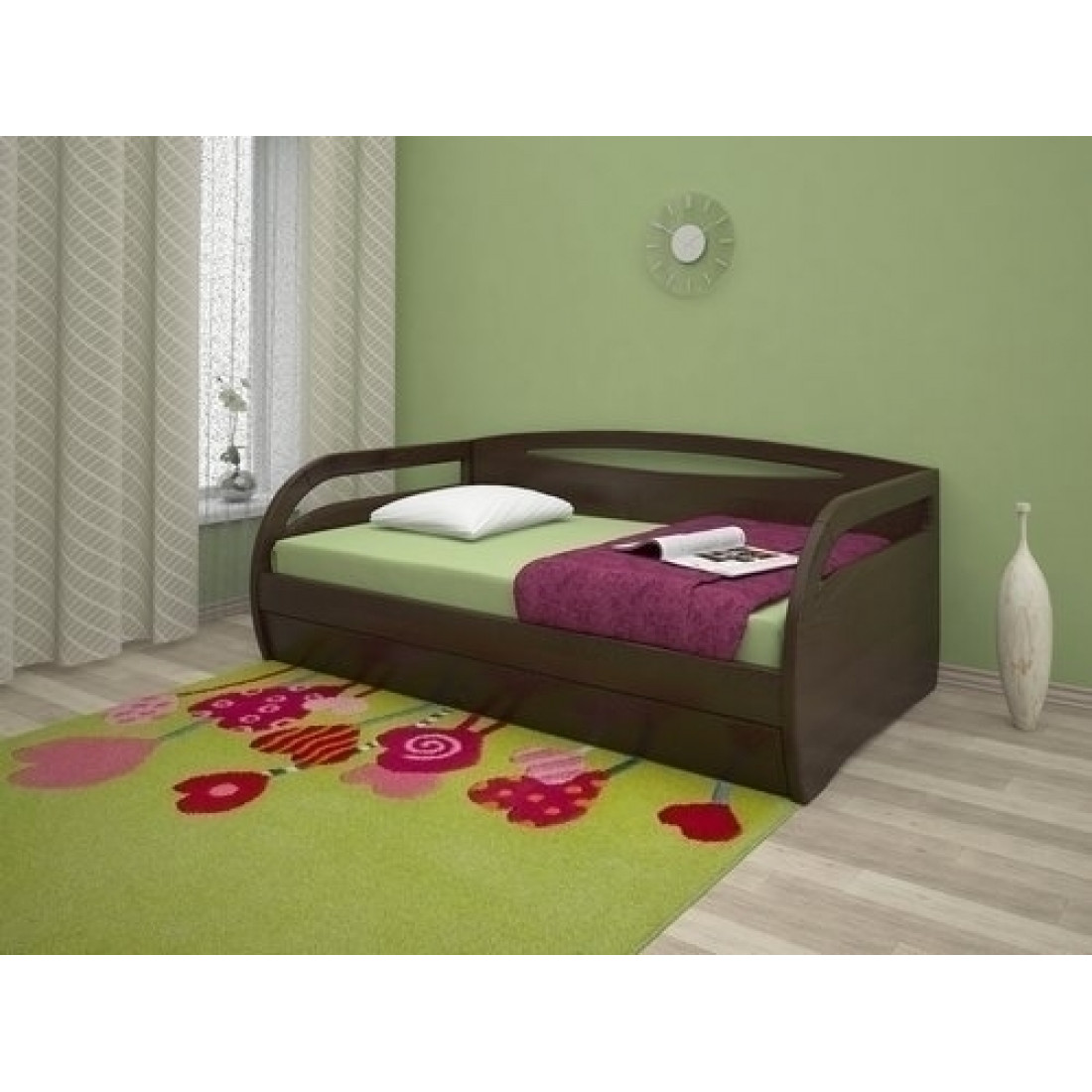 Кровать оснащена ортопедическим основанием для матраса — гнутыми ламелями.
