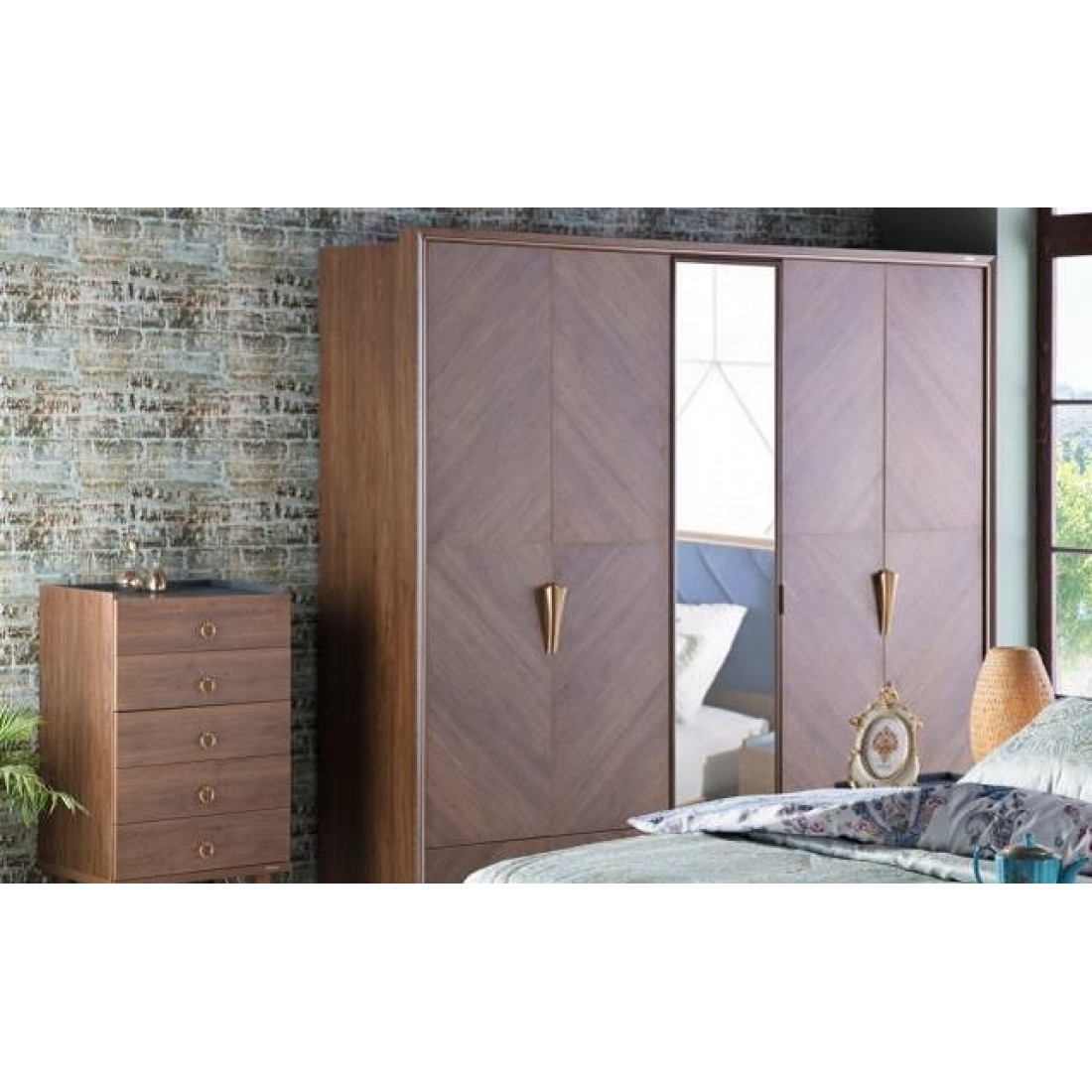 Пятидверный   шкаф для одежды с зеркалом в спальню Пальма PALMA-33   размером 2324х2354х578мм  от Беллона выполнен в необычном дизайнерском решении. Оригинальный рисункок пленки на фасаде дверей и ящиков, имитирующие шпон натурального дерева.Оригинальный рисункок пленки на фасаде дверей и ящиков, имитирующие шпон натурального дерева. Комбинированная модель шкафа с 4 дверьми и 4-мя ящиками , дополненная зеркалами, классический темный цвет орех и сочетание современного, заметьте неизбитого дизайна- это то что нужно Вашему интерьеру!