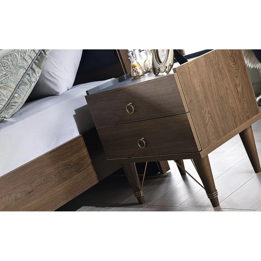 Прикроватная тумба Пальма PALMA-27 от Беллона выполнена в соверменном дизайне, котрый подчеркнут оригинальным рисунком пленки на фасаде дверей и ящиков, ручками золотистого цвета, высокими ножками с металлическим декором золотистого цвета. Благодаря стильному, эффектному оформлению модель придаст дополнительный лоск интерьеру. Купить прикроватную тумбу к спальной зоне рекомендуется в количестве 2 шт, для симметричного расположения по бокам кровати. При ограниченном пространстве можно ограничиться одной.