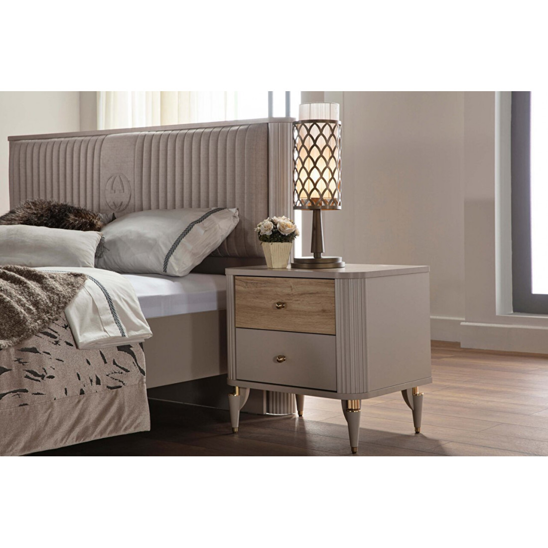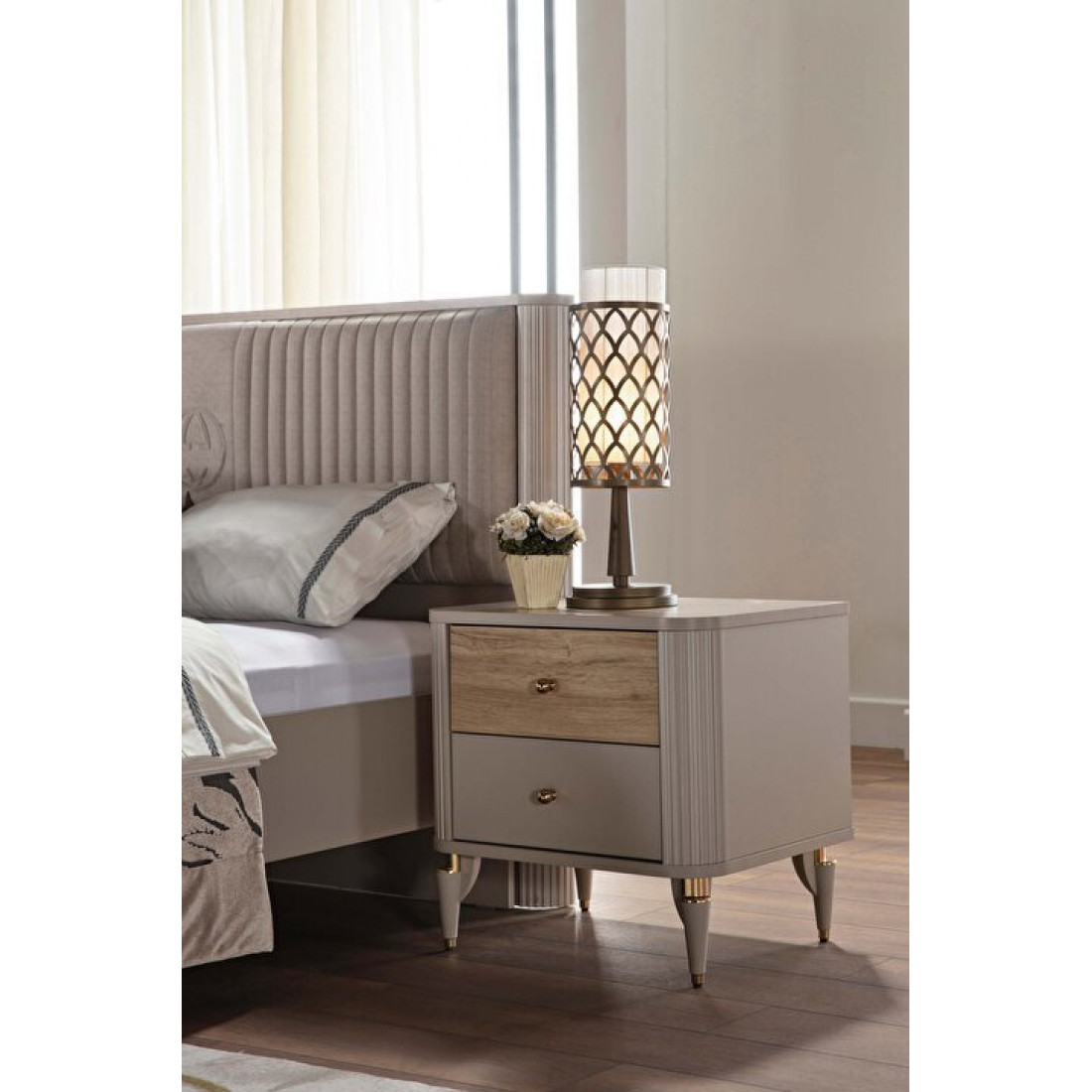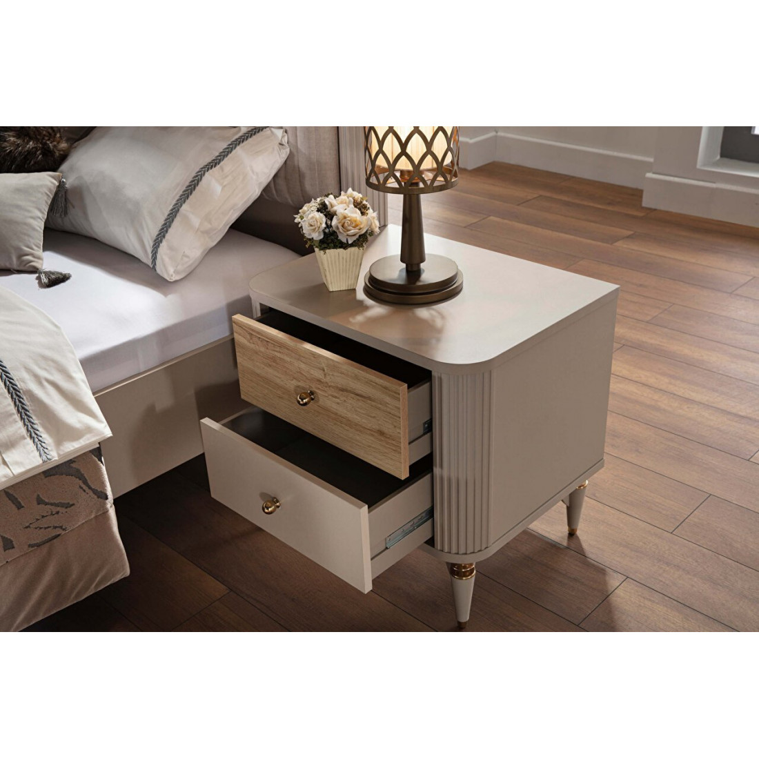 Прикроватная тумба Санвито SANV-27 SANVITO (62х47х61) )прекрасно дополнит ваш спальный гарнитур. Нежный кремовый цвет в сочетании с золотистой фурнитурой ручек и ножек создает атмосферу тепла и уюта в комнате. Комбинированные фасады ящиков с фактурой дерева придают особый шарм тумбочке. Выдвижные ящички позволяют хранить необходимые принадлежности. Скругленные углы с рифленой поверхностью завершают романтический образ прикроватной тумбочки.