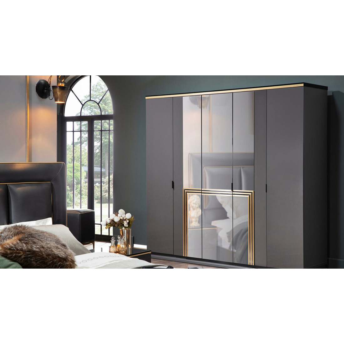 Шкаф Carlino Bellonaв вместительный предмет интерьера  с пятью распашными дверьми, в котором поместится очень много одежды и вещей. Три зеркальные двери с золотым декором по центу, крайние  двери цвета антрацит..