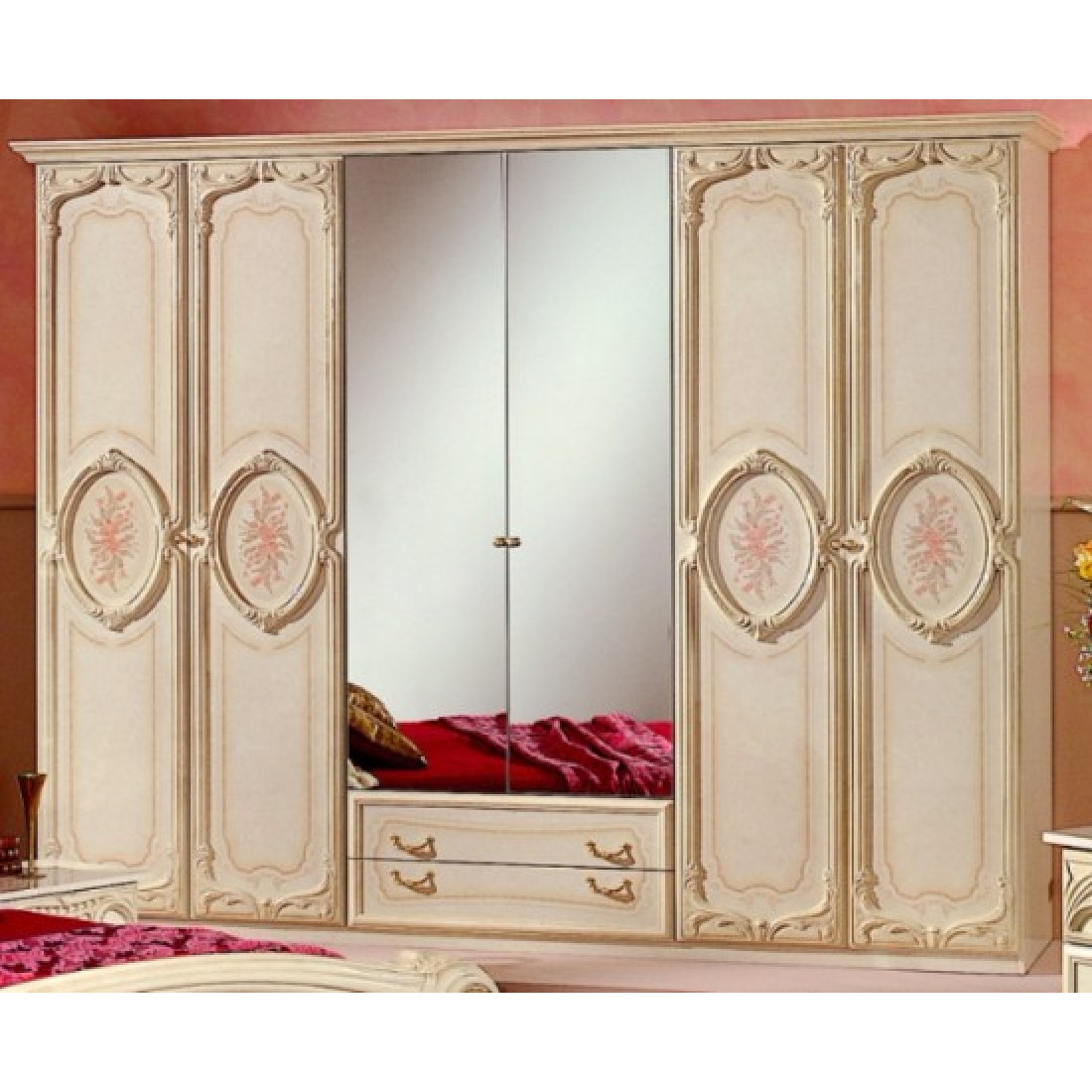 Шестистворчатый шкаф для одежды Роза (беж) от Российской фабрики "ДИА мебель". Модель шкафа выполнена в классическом стиле. Бежевый цвет с глянцевым покрытием придает больше эстетичности. Два больших зеркала в центре с легкостью придадут чувства легкости и визуально расширят пространство в комнате. Шкаф поделен на три части, каждая из которых имеет не только вместительные полки для одежды но и большую штангу для вешалок. Такой большой шести створчатый шкаф поможет Вам сэкономить место и удивит своей вместимостью.