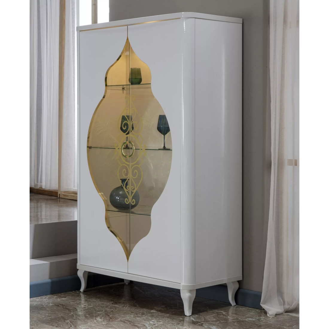 Дизайн шкафа для посуды "Легенда" определенно заслуживает Вашего внимания. Изделие представлено в классическом белом стиле с золотистыми рисунками на стеклянных дверцах и белыми изогнутыми сужающимися к полу ножками. За счет использования высококачественных материалов, удалось добиться долговечности данного изделия.