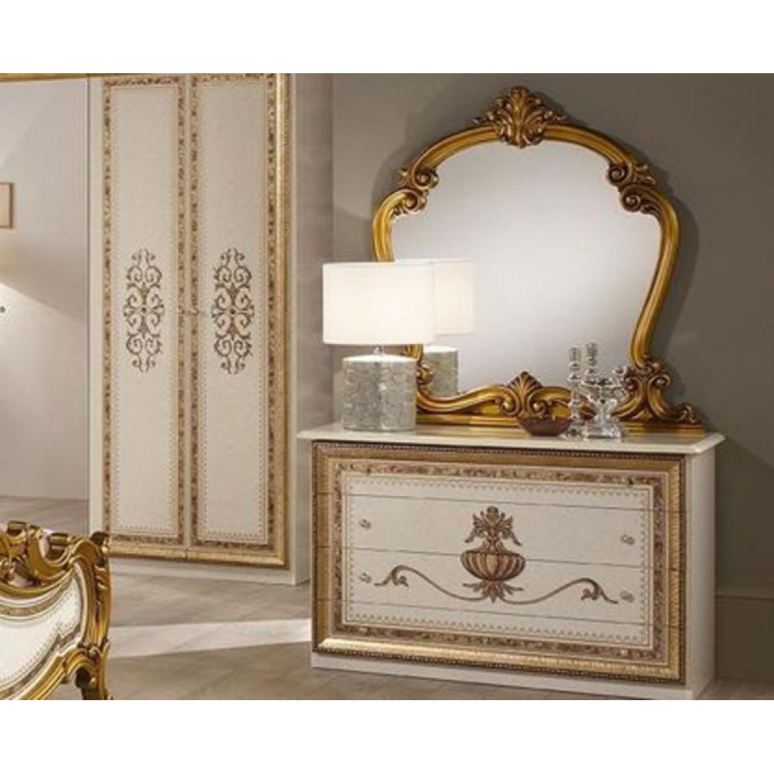 Спальня Анита (беж) композиция 2 от Российской фабрики "ДИА мебель". Выполнена в бежевом цвете с отделкой золотых фасадов. Такой дизайн поможет Вам расслабиться после рабочего дня и насладиться прекрасной атмосферой. Классический стиль придают интерьеру неповторимую роскошь. Изгибающие линии кровати и зеркала придадут легкость и воздушность в спальне. Коллекция "Анита" придаст вашей спальне экстравагантность, и принесет свежие нотки в Ваш дом.