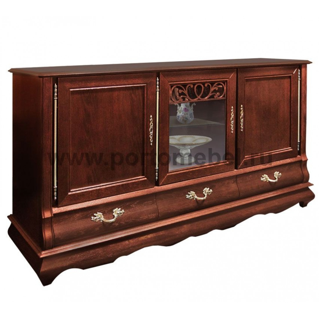 Классическая трехдверная тумба с выдвижными ящиками из коллекции "Оскар". Декорирована изящной резьбой и фурнитурой. Создана из массива дуба и окрашена в оттенок "Орех".